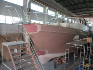 This week, you’ll see the bow railing being initially fit in addition to the bridge deck coming out of the mold. The staterooms and galley continue to receive coats of varnish followed by lots and lots of sanding in between coats. There’s not much to see in the salon at this point as there is no floor installed yet. Since it sits above the engine room, they are awaiting arrival of the engines and generators before they can put the floor in. Watch your step!