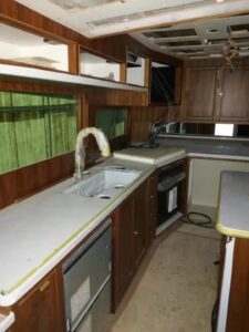 This week we get a nice look of the galley with all of the counters in and covered in protective sheeting. The island is a nice focal point and will be a great work space. We also see the stairs are now in leading from the galley up to the command bridge.