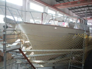 This week you’ll see the initial coats of the “Oyster White” hull color being applied. Plus, the first look at the Command Bridge deck coming together. This will sit above the Salon & Galley once it’s put in place later in the build. Progress continues on the interior staterooms and Galley-Dinette area as well.